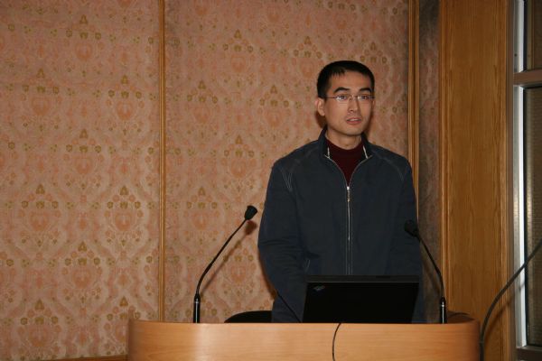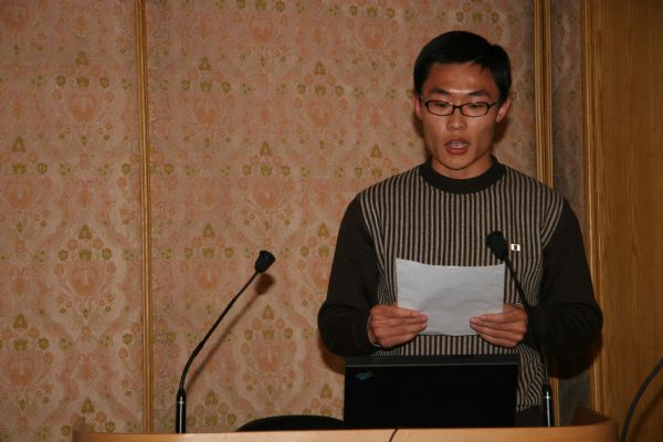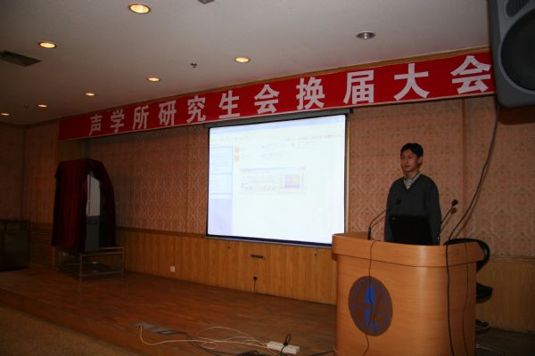 会议在雄壮的国歌声中开幕,首先,第五届研究生会主席熊亮认真总结了研究生会的成长历史及在04—06年的工作进展情况。声学所研究生会自1995年起有雏形,但当时学生人数较少,故一直未曾独立活动。至2004年,所内的在读学生已由2000年的100多人增至350多人,在所内领导的亲切关怀和积极倡议下,声学所研究生会2004年10月22日正式成立,并确立为第五届研究生会,由01级硕博连读生熊亮任主席。研究生会自成立始,就积极为所内学生组织各种文体活动,丰富大家的业余生活,协助声学所各部门做好所里的各项工作。由研究生会主办,先后组织了首届研究生趣味运动会、“五一”云蒙山春游、春游有奖征文及摄影活动、05年毕业生欢送会、毕业生座谈会、参加东芝动物乐园等数项活动。其中“五一”春游、毕业生欢送会、毕业生座谈会已经成为研究生会每年的固定节目。研究生会下属还成立了羽毛球协会、游泳协会、跆拳道协会等数个兴趣协会,进一步扩展大家的兴趣爱好。此外,研究生会每年都与团委携手,共同组织所里的卡拉OK比赛,春节团拜会等声学所的重大活动。在每年的所开放日,研究生会也都起了很大的协助作用。研究生会在这么短的时间内取得了这么好的成绩,离不开所党委、所领导的关怀和支持,离不开人教处、办公室等职能部门的牢靠保障,也离不开研究生会成员的辛勤付出及广大同学的热心参与和大力支持。