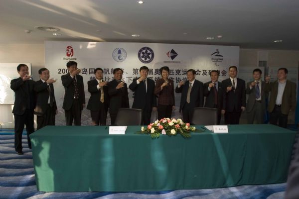2007年4月3日,院高技术局阴和俊局长和奥帆委在青岛网通大厦签署了《2007青岛国际帆船赛、第29届奥林匹克运动会及残奥会帆船比赛水下安保系统合作协议》。院高技术局信息处戴博伟处长和声学所田静所长、张春华副所长、黄正所长助理、易洪所长助理、北海站张胜坚站长、刘好椿书记和图像声纳实验室主任许枫研究员以及西光所马彩文副所长出席了签约仪式。青岛市副市长、奥帆委常务副主席臧爱民莅临签约仪式并发表了讲话。
