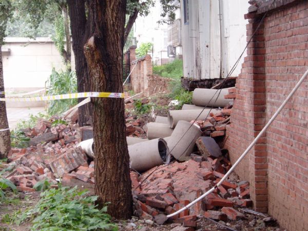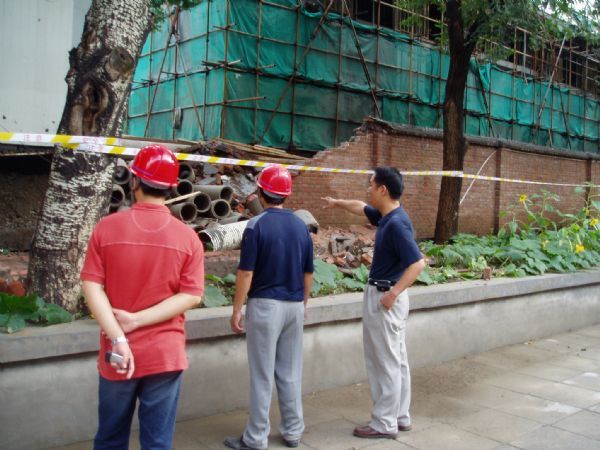 2007年7月30日夜间一场如注的暴雨使得声学所香山园区与植物所之间的隔离墙坍塌了24米长的大豁口,由于事发凌晨时分,没有造成人员伤亡。环声物业驻香山代表袁嘉光等同志已于第一时间用安全隔离带将现场保护好,在外地出差的潘锋副所长31早7点多接到报告后马上指示所基建办公室主任程源军尽快到现场处理。早上8点多所基建办公室主任程源军和孙平同志一同到达现场,与植物所相关部门人员协商处理,经过协商植物所同意将围墙重新修补。随后植物所基建办人员指挥相关人员进行了现场清理和围墙的修补工作,保证了在香山工作的科研人员有一个正常的治安秩序。