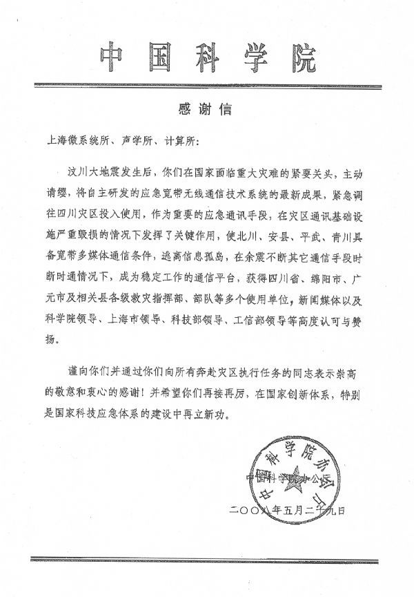 院办公厅发来感谢信 慰问声学所赴地震灾区科技救灾人员