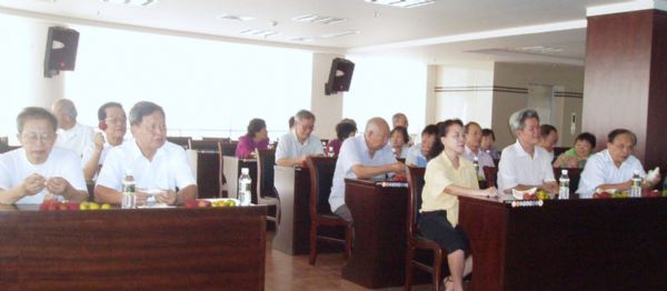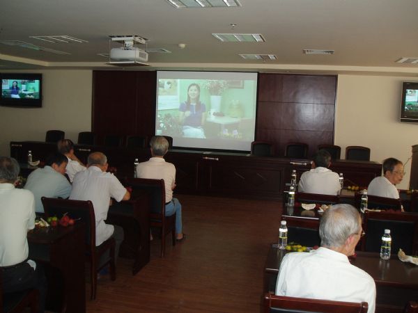 退休职工在多功能会议厅观看保健知识讲座