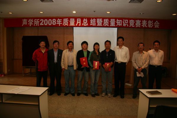 在这种情况下,为积极响应所里2008年“质量月”活动的各项要求,进一步加强质量知识的宣贯,提高全员质量意识,实验室制定了具体的学习计划并于9月12日组织在所内的职工和学生进行了质量管理知识的集中学习,对于在青岛参加水下安保任务的职工和学生,不仅将“2008年声学所质量知识考核题”通过电子邮件的方式发给了大家,而且在两位主任的组织下在现场进行了学习,完成了答卷。