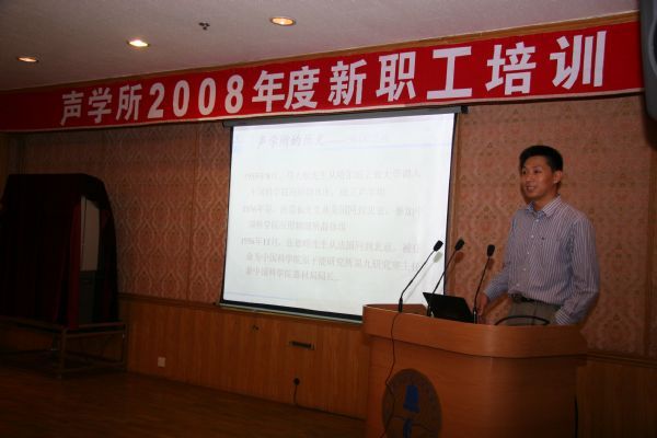 张春华副所长在报告中介绍了声学所的基本情况、发展历程、主要研究方向、主要科研条件、人才队伍构成和取得的各项成就,阐释了声学所的管理体系及组织文化、学科定位及发展方向。张副所长在报告中说,声学所的治所方针是“科学管理,依法治所”,希望大家尽快适应和融入声学所的创新文化环境,积极投入工作,敢于发表自己的观点,知无不言,言无不尽,营造和谐的创新氛围,秉承“标新立异,亲自动手;奋力拼搏,一丝不苟”的所训,在“国家的声学所”里,将自己培养成“国际的科学家”。