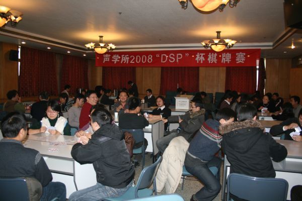 12月8日,由国家网络新媒体中心赞助的声学所2008“DSP”杯棋牌赛在DSP大楼多功能厅如期开战,广大职工和同学怀着极高的兴趣和热情参加了此次比赛。活动秉持着以人为本的理念,希望通过此次比赛缓解大家的工作学习压力,促进相互间的了解和友谊。本次棋牌赛为学习实践科学发展观、建设和谐奋进声学所创造了新的良好氛围。