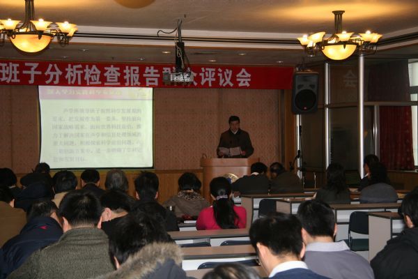 1月5日上午,声学所召开领导班子贯彻落实科学发展观分析检查报告评议会。所领导班子成员、党委委员、纪委委员、所长助理、职能部门负责人,院士代表、支部党员代表、工会(职代会)、共青团、妇委会、民主党派、无党派和学生代表共50余人参加会议。京区学习实践活动指导检查组第四组成员邵有余到会指导。
