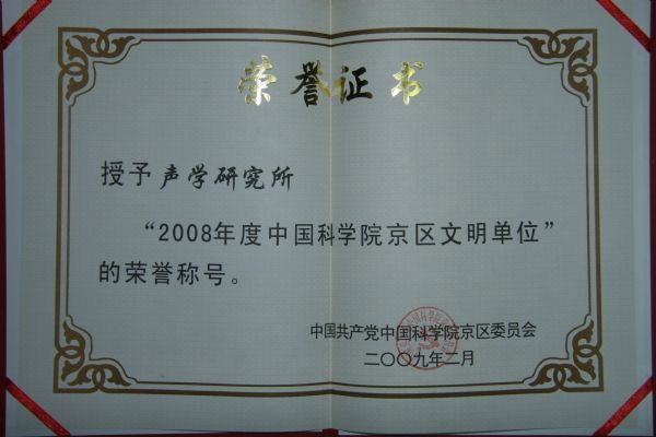 声学所荣获“2008度中国科学院京区文明单位”荣誉称号,这既是对声学所前一阶段精神文明建设工作的充分褒扬,更是对声学所巨大的鼓舞。2009年,声学所人必将在声学所党政领导班子的带领下以更大的热情、更高的标准投入到精神文明建设中,使全所的精神文明建设更上一层楼。