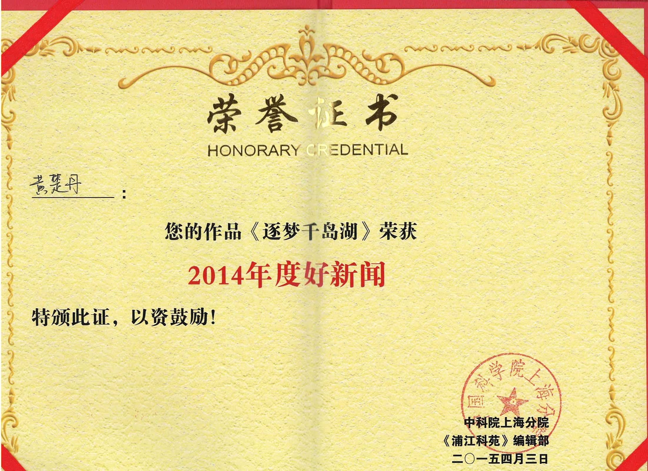 为进一步加强政务信息宣传工作,中科院上海分院、《浦江科苑》编辑部对2014年度相关优秀新闻作品、个人和集体进行表彰,我站黄楚丹《逐梦千岛湖》荣获“2014年度好新闻”。