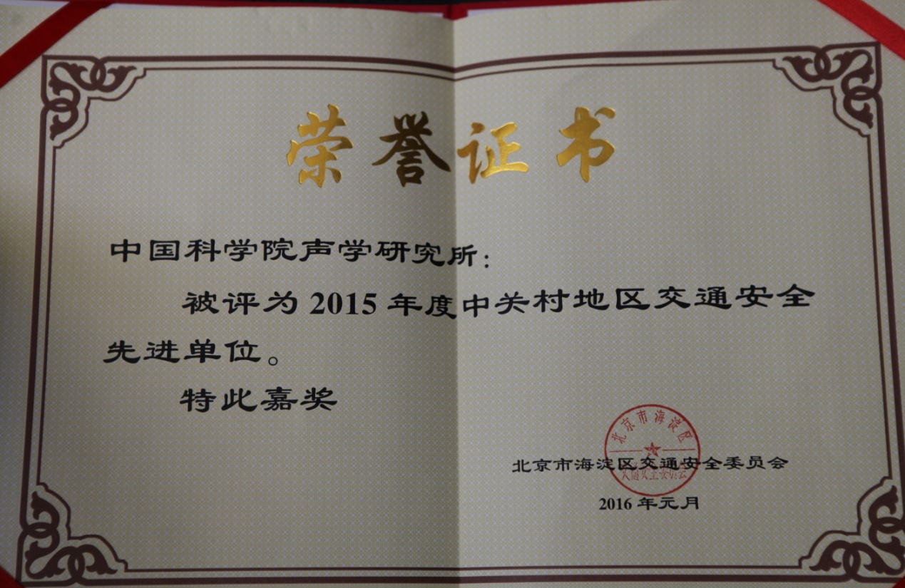 日前,声学所被评为“2015年度中关村地区交通安全先进单位”。