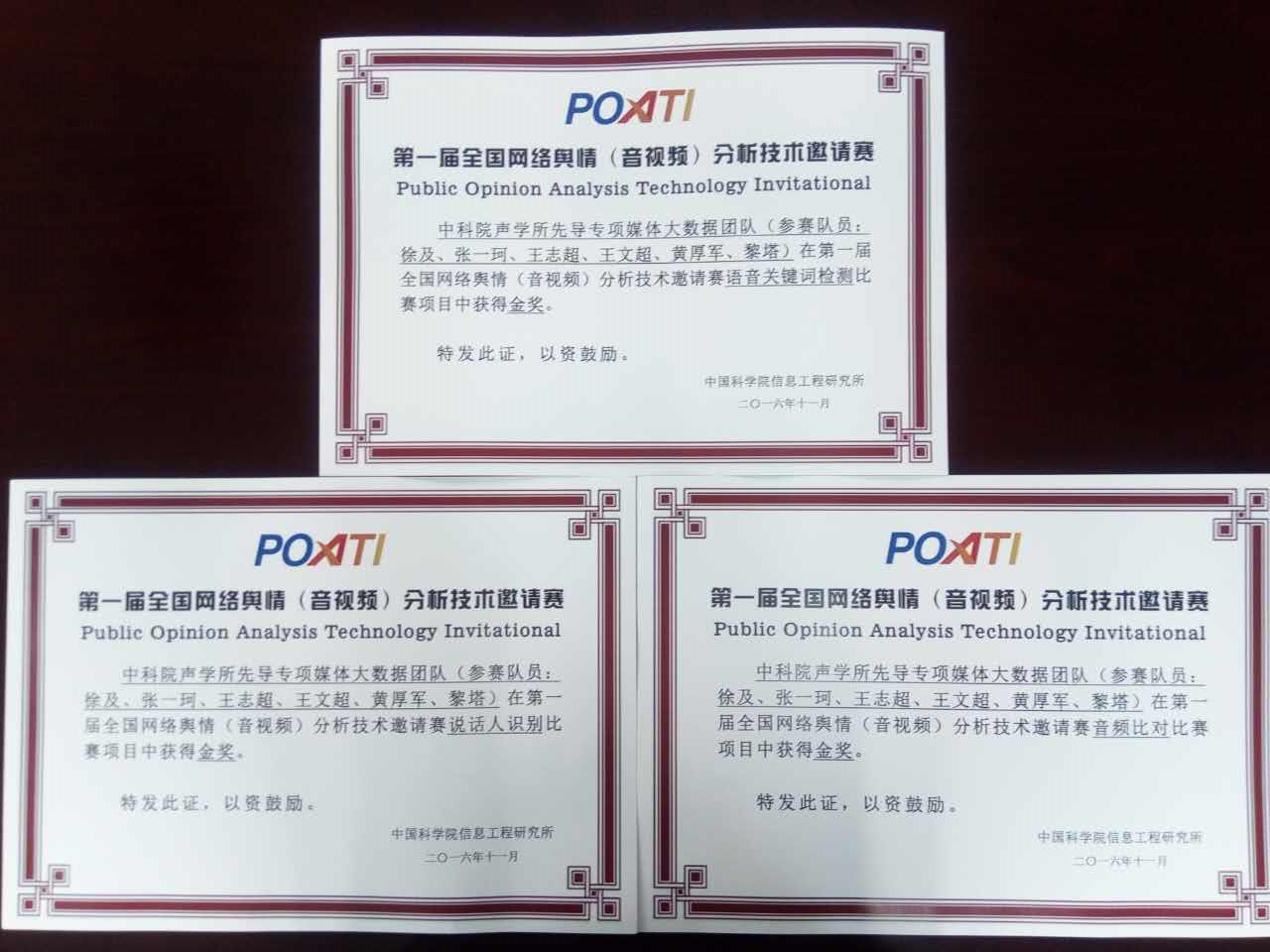 2016年11月5日,“网络多媒体智能分析高端论坛”在京召开,论坛为首届“网络舆情(音视频)分析技术邀请赛(POATI)”举办了颁奖典礼,中科院声学所语言声学与内容理解重点实验室的先导专项媒体大数据团队在该赛事中的音频比对、说话人识别和语音关键词检测三个项目中取得第一名。团队成员包括徐及、张一珂、王智超、王文超、黄厚军和黎塔。