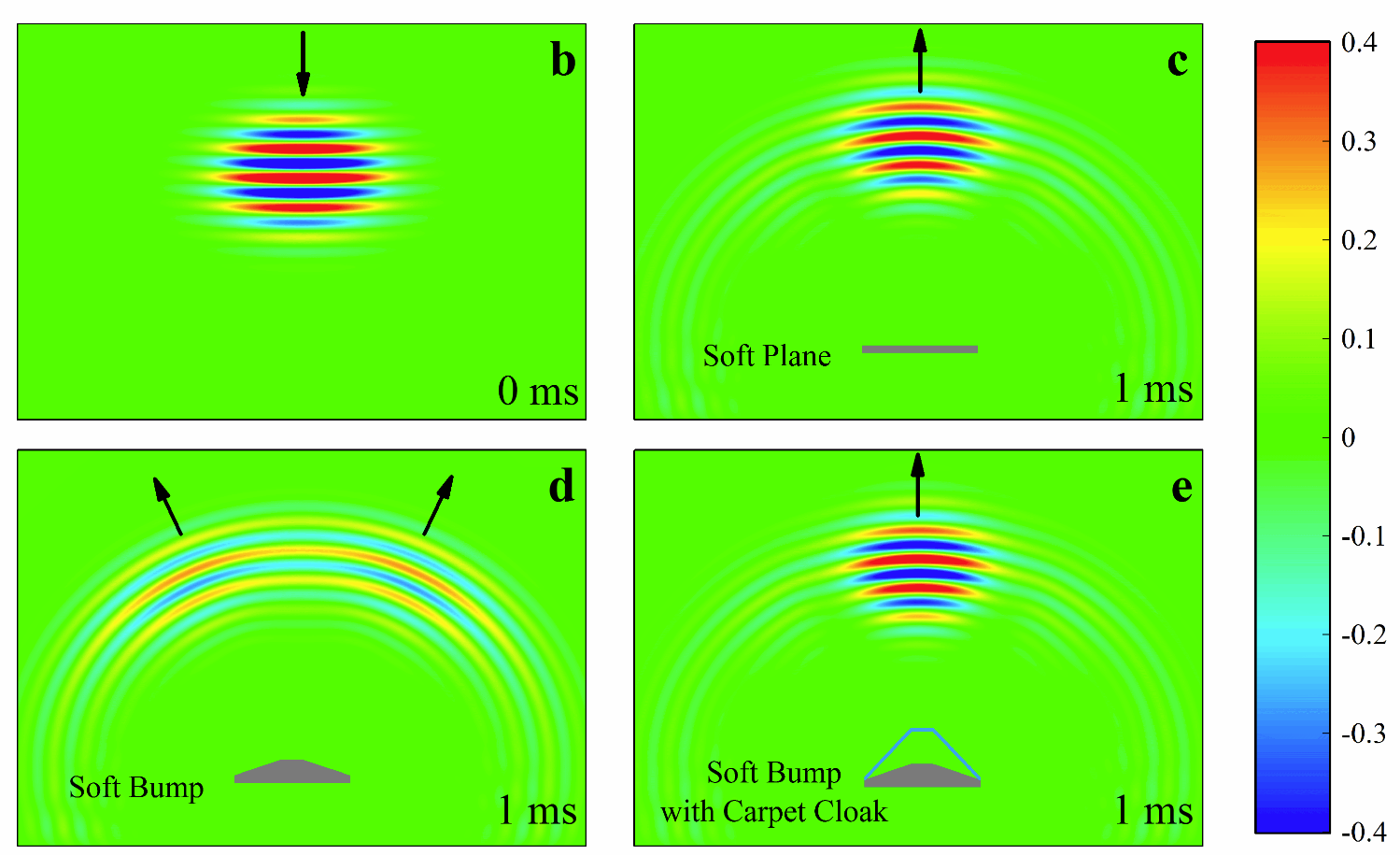 图 2. 水下声学隐身毯工作示意图(b为入射声场分布;c, d, e分别为平面、凸起散射体和覆盖毯后散射体的回波声场分布)